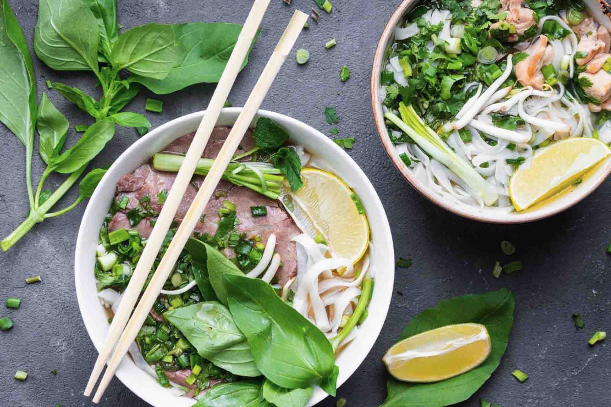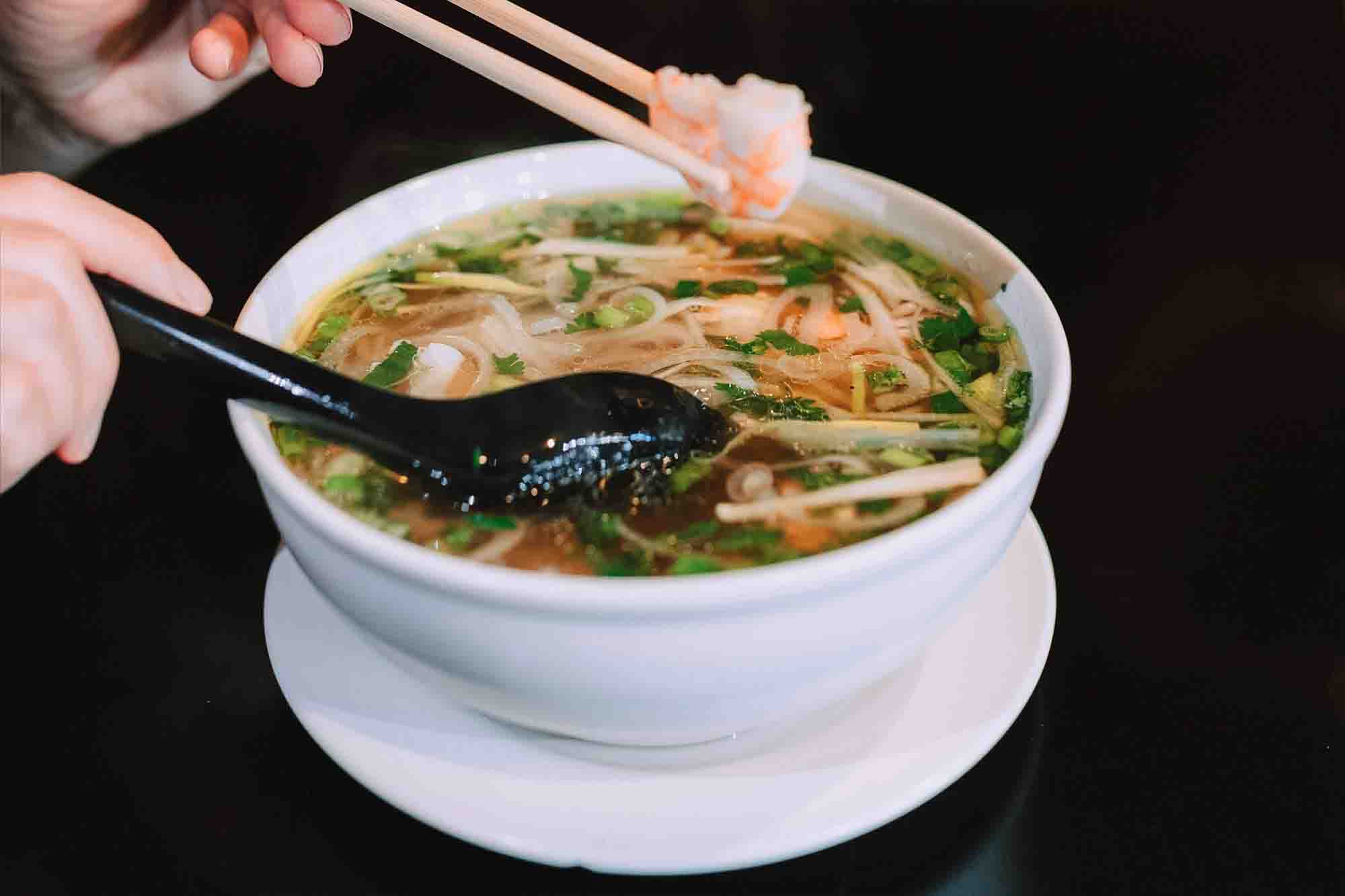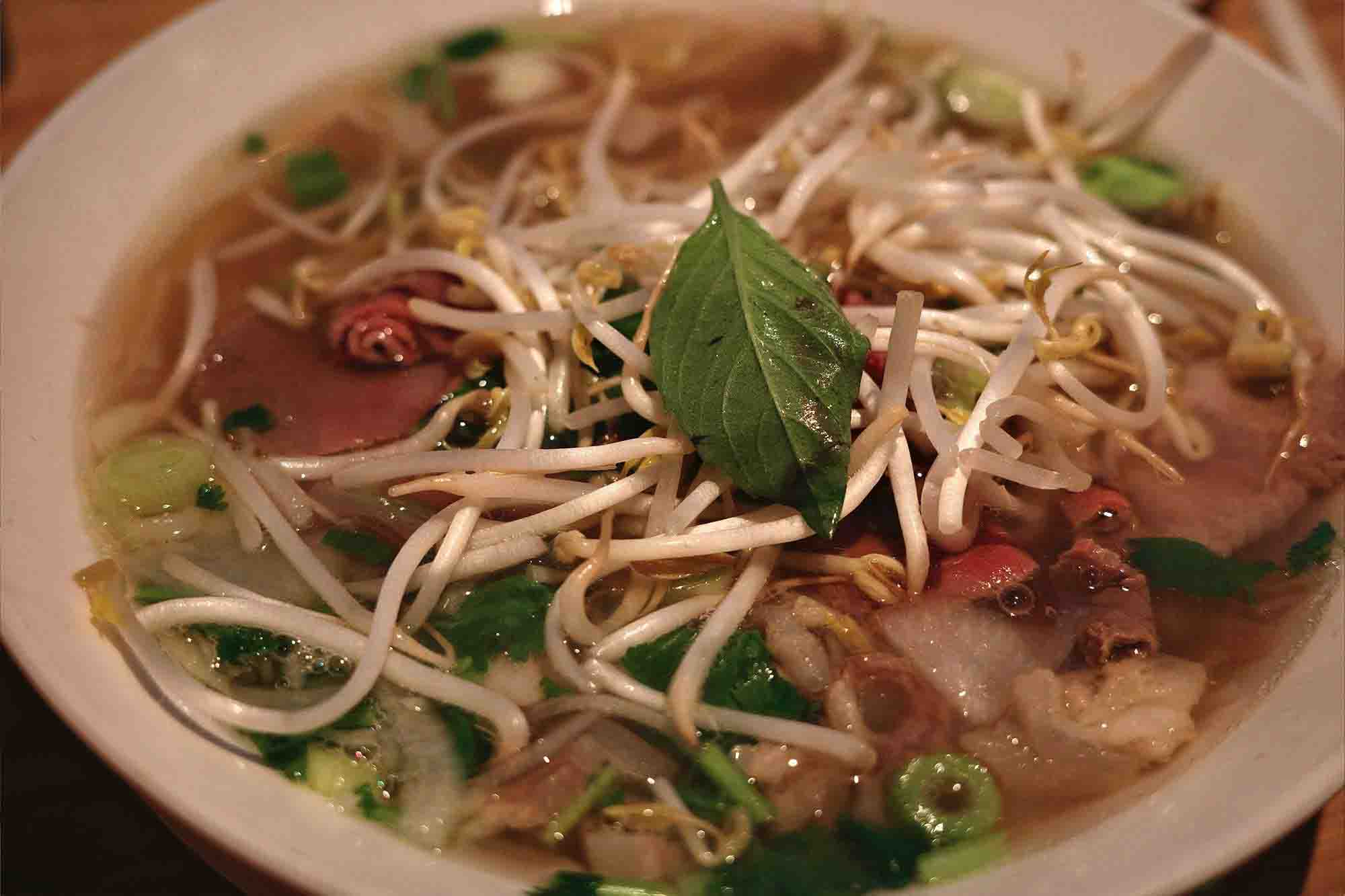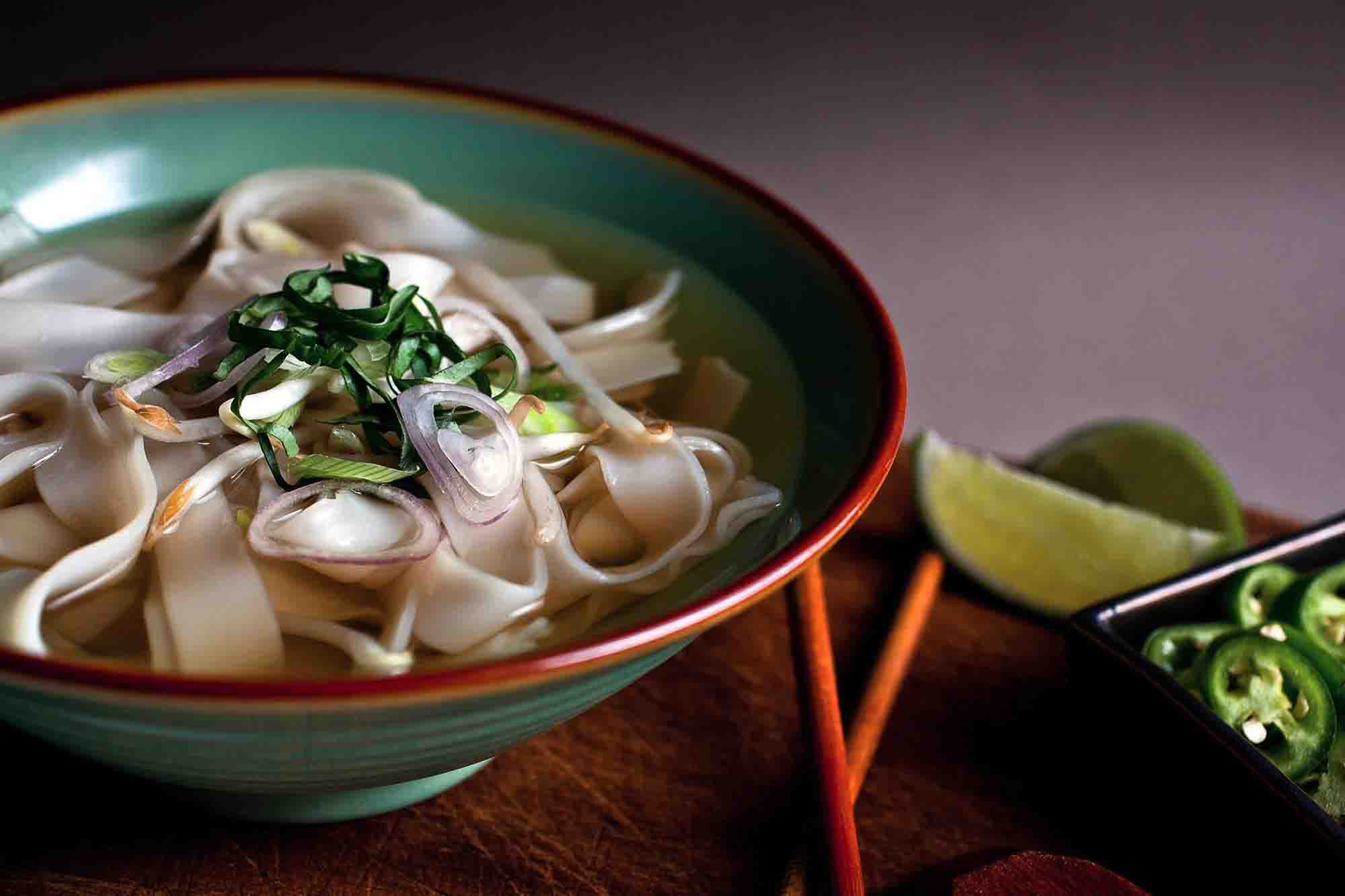 Find MoreGanh Pho noodle soup made with 24-hour simmered beef broth, rice noodles and your choice of meat, topped with onion, scallion, and cilantro, often served with bean sprouts and lime.