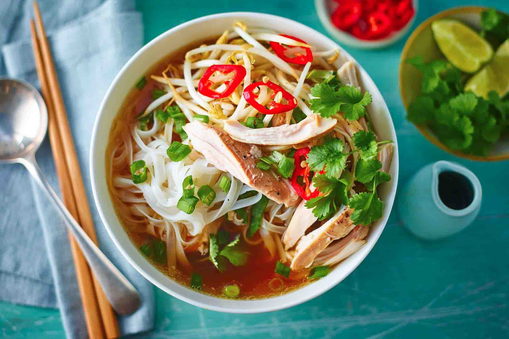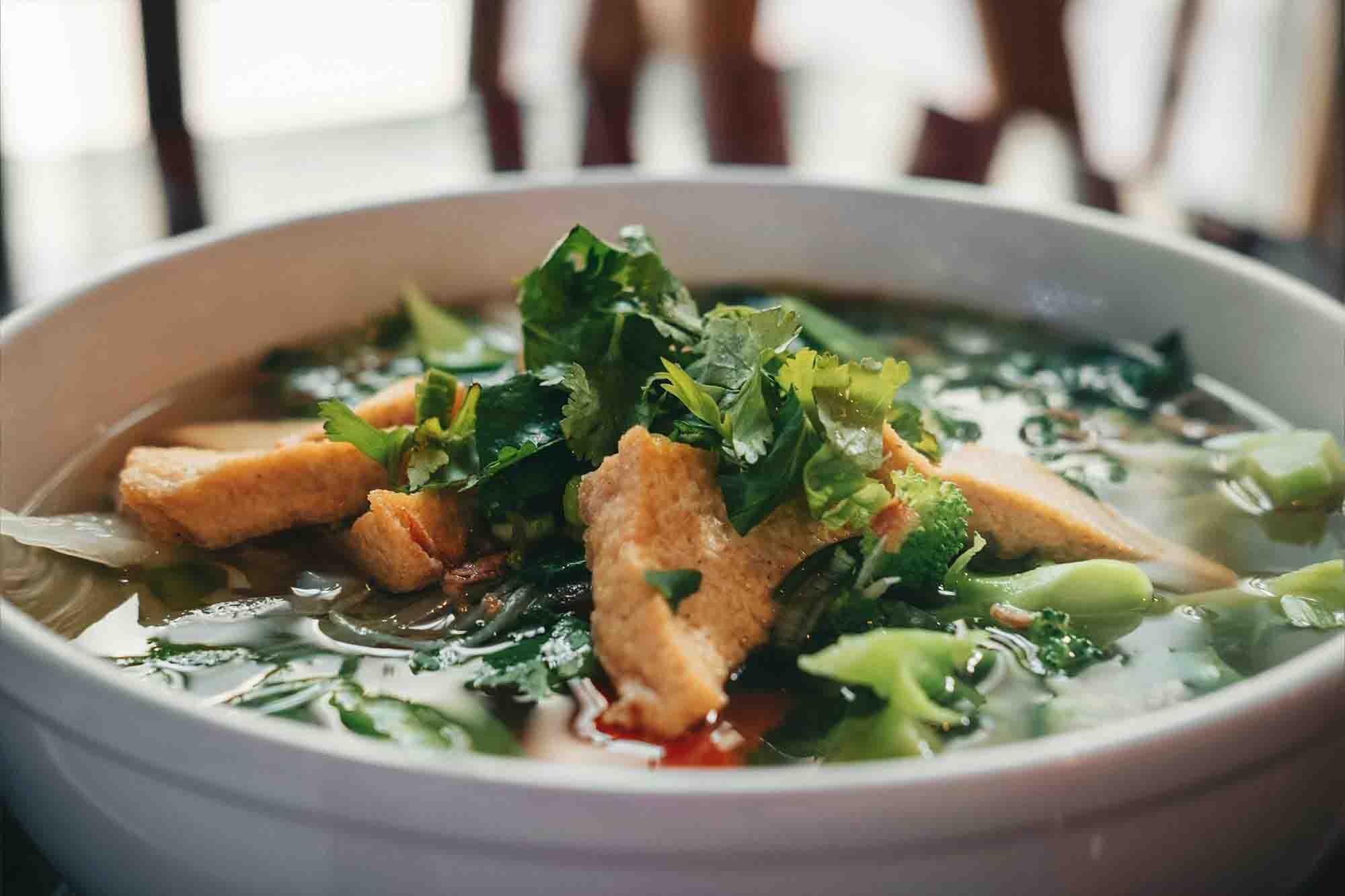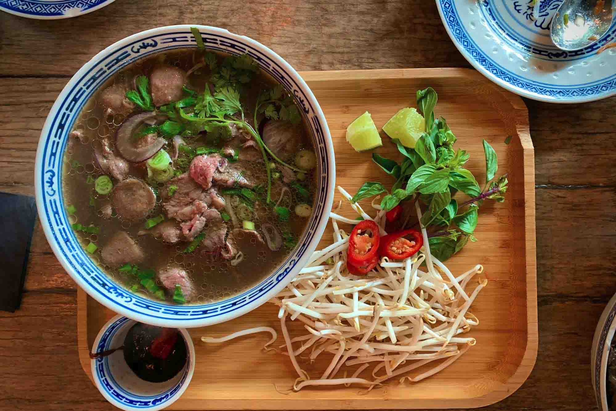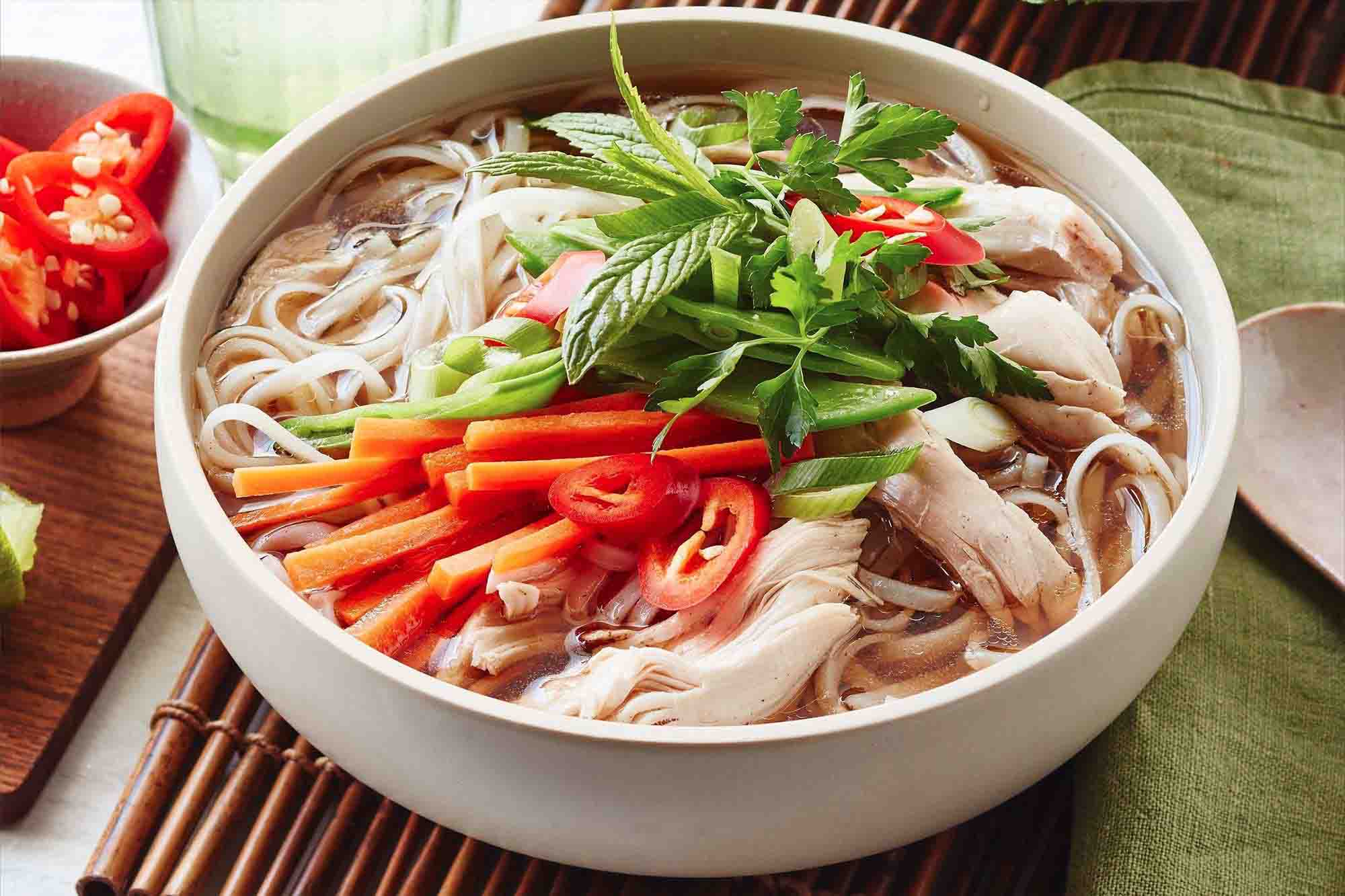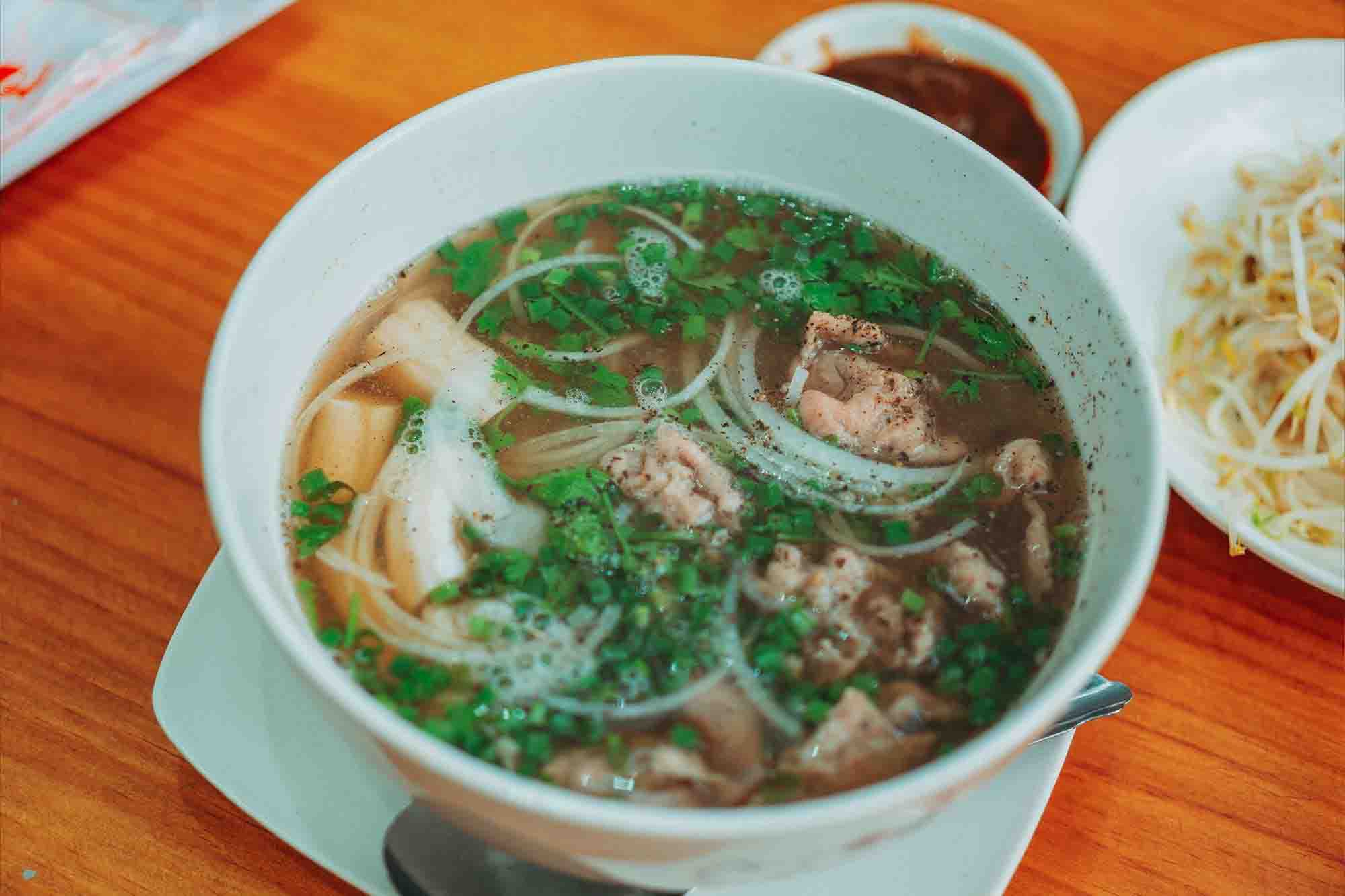 Find MoreGanh Pho noodle soup made with 24-hour simmered beef broth, rice noodles and your choice of meat, topped with onion, scallion, and cilantro, often served with bean sprouts and lime.